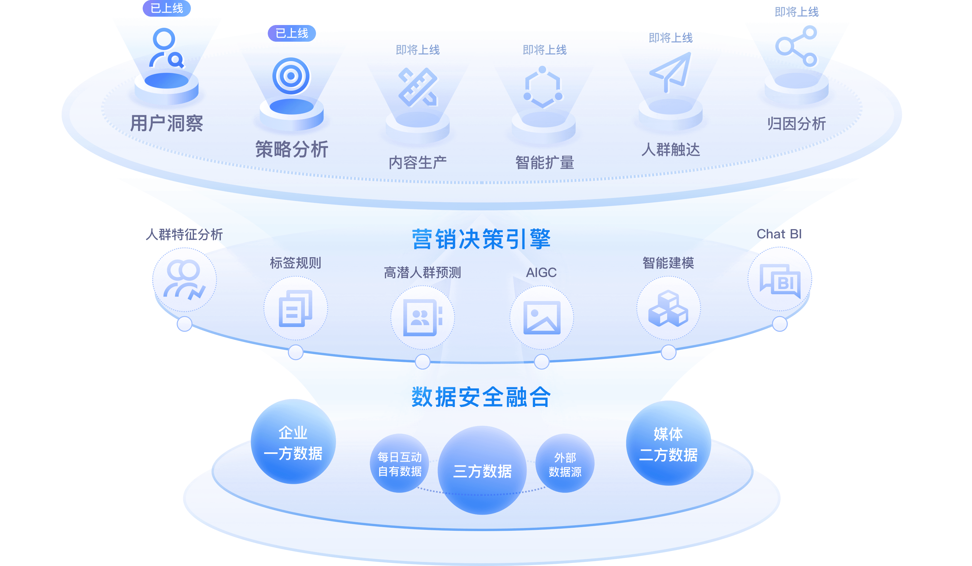 锁定高潜客群、输出精准投放策略、生成相匹配的内容素材一键投放、配套归因分析优化策略,实现完整营销闭环。