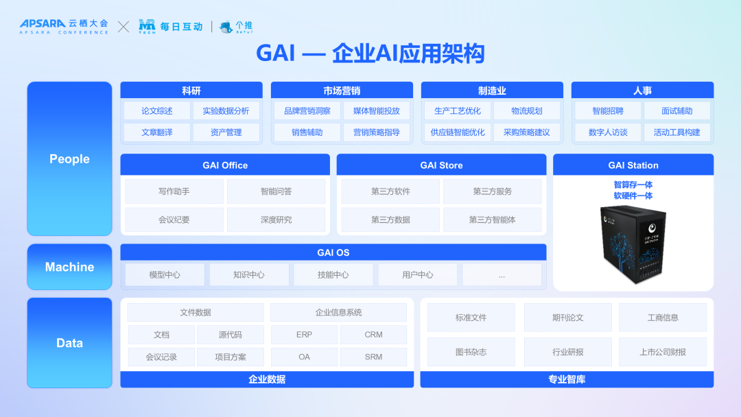 在数据(Data)层面,企业通过个知·智能工作站,不仅能接入各类文档,还能和企业内部OA、CRM等业务系统互通,同时外接国标行标、期刊论文、政经数据、行业研报等16大专业智库;在M层,个知·智能工作站通过内置的人工智能操作系统(GAI OS)将最核心的模型能力、知识检索和问答能力、Agent能力等通过API提供出来,供上层应用使用;在应用方面,个知·智能工作站不仅内置了一部分高频的、通用的AI原生应用,比如写作助手、会议纪要、智能问答和完全由AI驱动的深度研究等,还支持集成第三方AI应用、数据集,以及支持和行业客户深度共创,以最终形成面向政务、科研、工业、能源、营销等各个垂直领域的AI应用工具集,让AI真正被千行百业用起来。