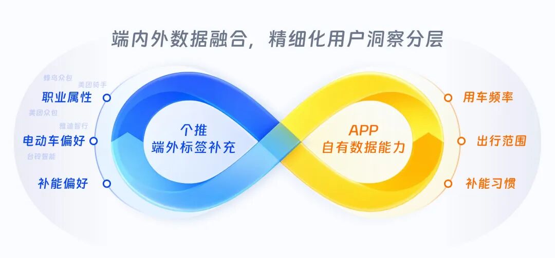 例如,依托个推的端外数据能力,可有效提炼出职业标签和“电动车偏好”“补能偏好”等核心用户特征;同时结合该出行类APP自有端内数据,包括用户用车频率、出行范围、补能习惯等行为特征,便能在个推用户运营平台上搭建起清晰有效的人群分组规则。借此,APP可从庞大的用户池中有效识别和筛选出外卖骑手、快递员等核心目标人群。