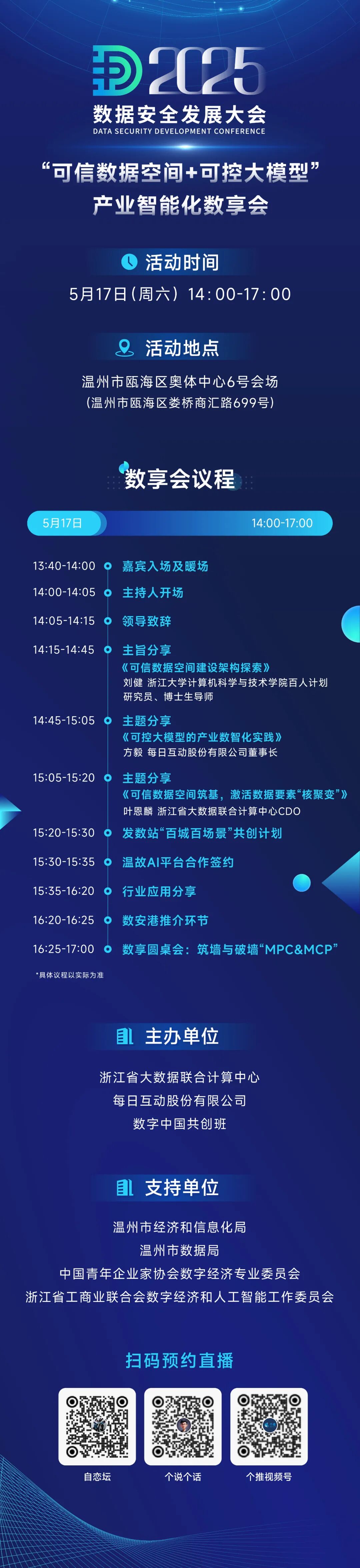 “瓯江论数 数安未来”。5月16-18日,2025数据安全发展大会即将拉开帷幕。作为一场全球数据产业的交流与合作的盛会,数安大会吸引了众多行业顶尖企业参与。本次大会期间,每日互动(个推)联合浙江省大数据联合计算中心、数字中国共创班共同举办“可信数据空间+可控大模型”产业智能化数享会,与主管部门、学界权威、行业先锋及生态伙伴一道,共探数据智能与人工智能的技术融合与场景突破。