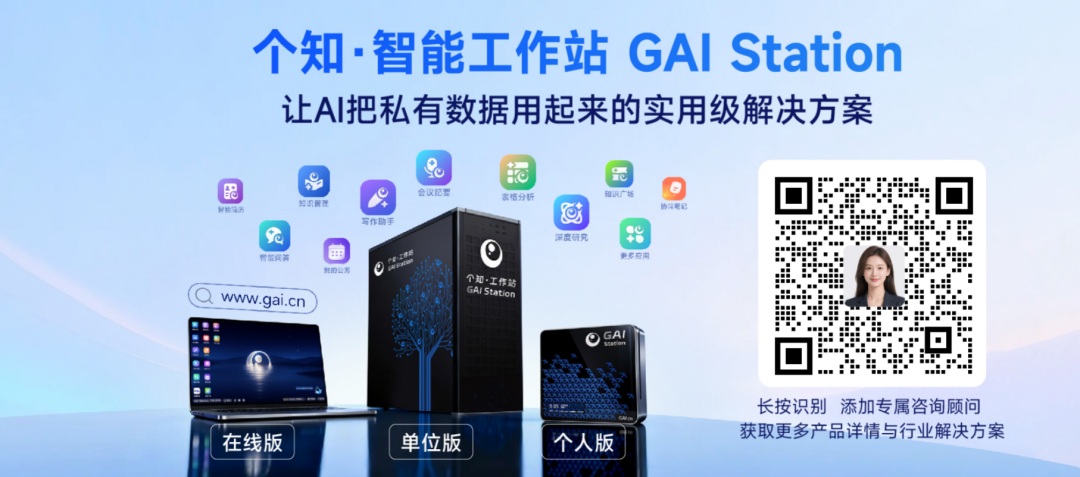 为了让AI用得起更用得起来,我们以轻量化的成本打造了多样化的个知·智能工作站,每人每天以一块钱的成本,就能享受到安全、实用、经济的AI。从支持百人协同的单位版、到便携高效的个人版,更有灵活便捷的在线版,个知·智能工作站精准适配从组织到个人的各种需求,轻松享受智能时代的技术红利。