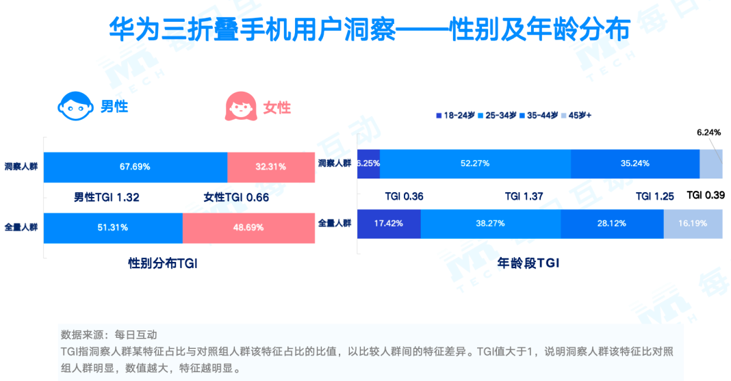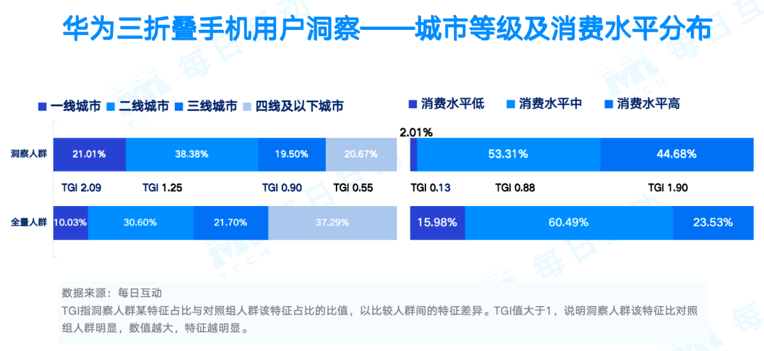 而此前火爆的折叠屏市场虽然在24年一度遇冷,但是华为三折叠手机的推出重新给“折叠屏”带来热度。每日互动大数据对华为三折叠手机用户进行洞察,发现该用户群体画像呈现出以下特点:多为高线城市高收入群体,其一线城市TGI达到2.09,高消费水平特征达到1.90,具有较强的经济实力支撑其购买高端产品。