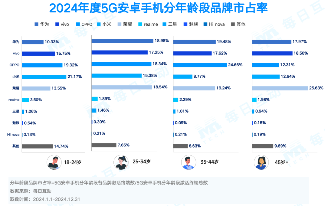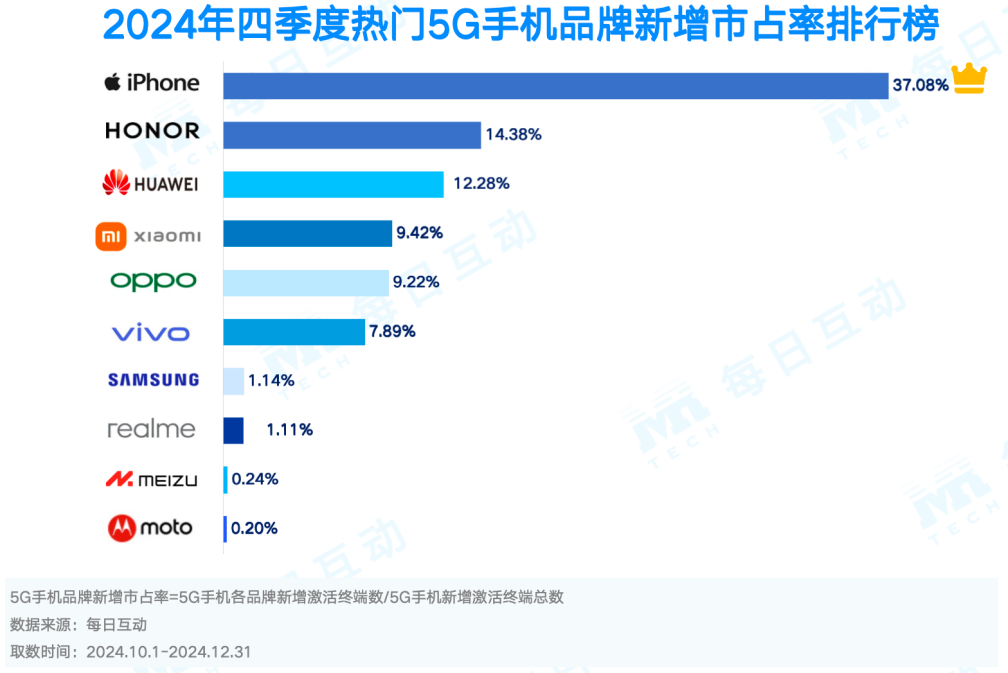 此外,荣耀、华为表现不俗。每日互动大数据显示,2024年四季度,荣耀当季新增市占率达到14.38%,位居第二,同比增长51.85%,较24年年中增长12.61%;华为当季新增市占率12.28%,同比增长26.86%。这也是两大品牌近两年在季度新增榜单上取得的最好位次。除了津津乐道的品牌忠诚度,2024年两支国货劲旅一面在高端市场大势回归,一面在中低端市场持续发力,加之价格刺激,终在第四季度功成名就。这样的表现对应到当季新增市占率排行上更加有迹可循。