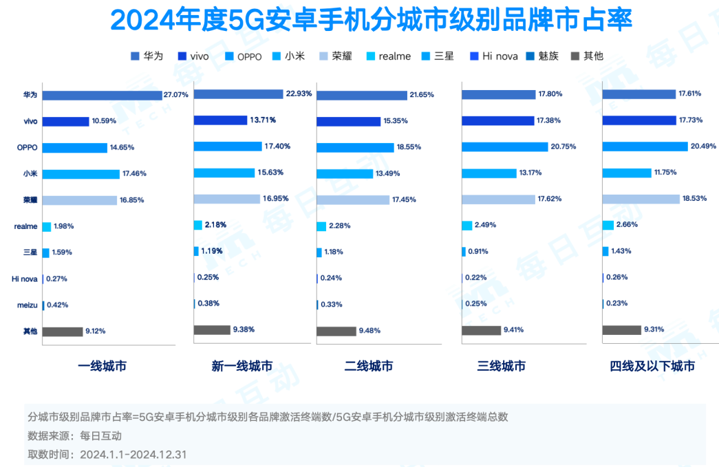 2024年小米稳稳发力,全线城市市占率均得到提升;此外魅族手机自从去年一季度再获关注以来,不能说高歌猛进,实际上也在稳步增长,尤其在一线、新一线及二线城市等重要战场,相比2024年中,分别取得了7.7%,11.8%及10%的增长战绩。