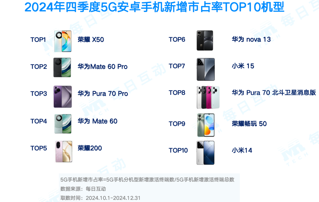每日互动大数据显示,荣耀X50成为2024年四季度5G安卓手机新增市占率榜首。而华为Mate 60系列和Pura 70系列的全线回归,更使得华为在四季度安卓市场上表现亮眼。2024四季度5G安卓手机新增市占率排行榜中,这两大系列共上榜4款机型。