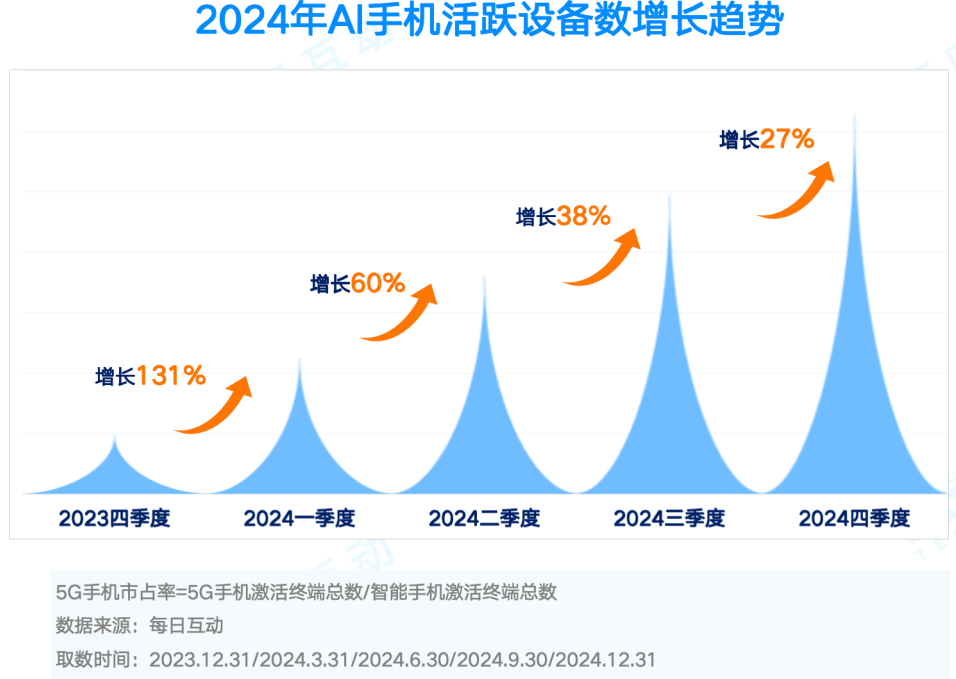 说到2024,逃不开的话题就是AI。这一年,不仅AI应用开始走进普通人的生活,AI功能在智能手机上的搭载以及基于AI的原生开发让国内手机厂商卷出天际。每日互动大数据洞察发现,2024年一季度AI手机设备量暴增,较上季度增长131%;之后市占率持续稳定增长,直到下半年增长趋势开始放缓。